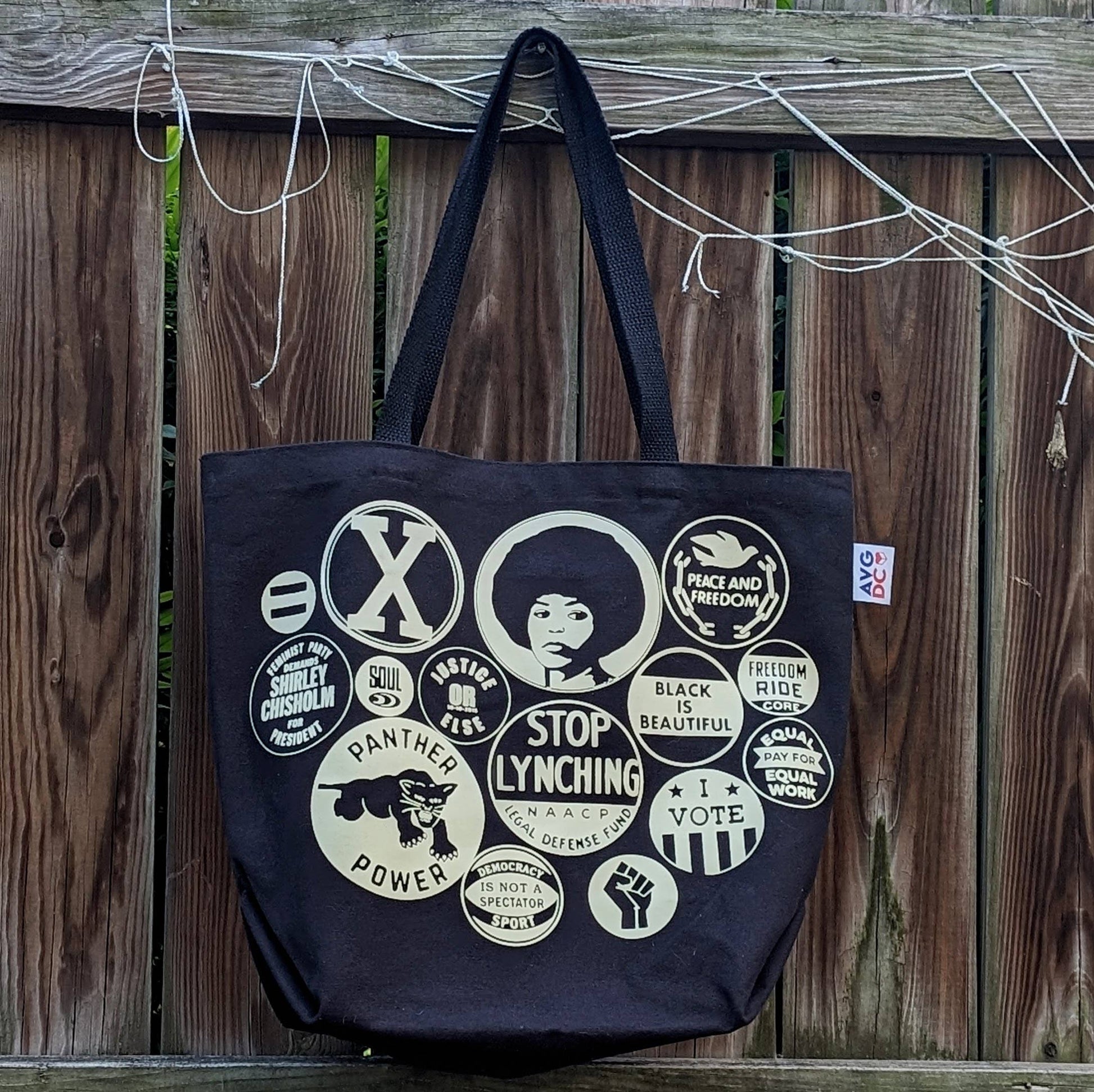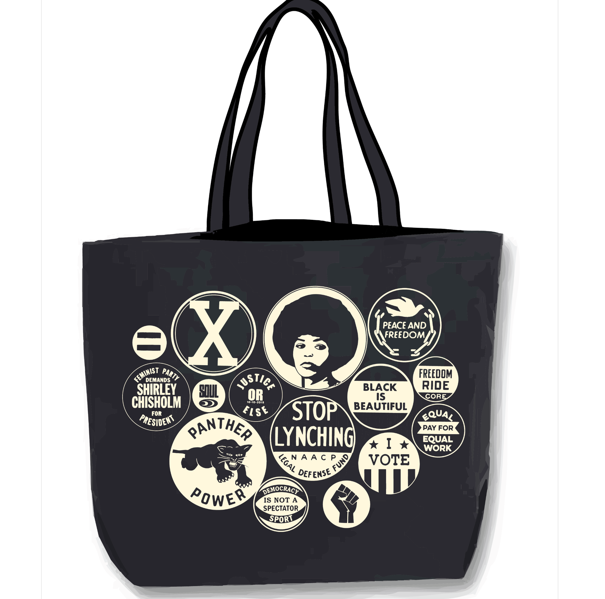 Tote bag inspired by campaign and activist buttons in the archives of the National Museum of African American Culture and History.